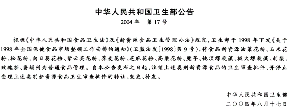 衛(wèi)生部公告2004年第17號(hào)(關(guān)于注銷油菜花粉等食品新資源衛(wèi)生審查批件等)