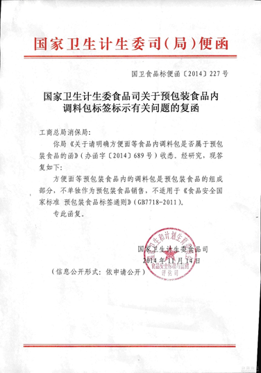 國家衛(wèi)生計(jì)生委食品司關(guān)于預(yù)包裝食品內(nèi)調(diào)料包標(biāo)簽標(biāo)示有關(guān)問題的復(fù)函(國衛(wèi)食品標(biāo)編函[2014]227號(hào))中規(guī)定:方便面等預(yù)包裝食品內(nèi)的調(diào)料包是預(yù)包裝食品的組成部分,不單獨(dú)作為預(yù)包裝食品銷售,不適用于《食品安全國家標(biāo)準(zhǔn) 預(yù)包裝食品標(biāo)簽通則》(GB 7718-2011)。因此方便面等食品內(nèi)的調(diào)料包可以不按照GB 7718進(jìn)行標(biāo)識(shí)。