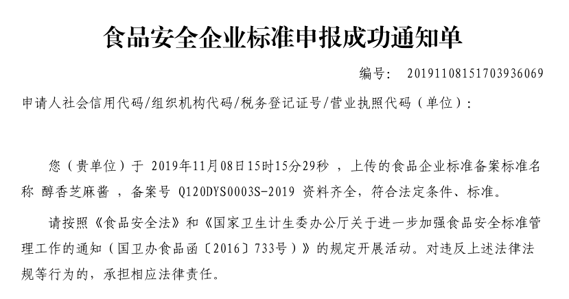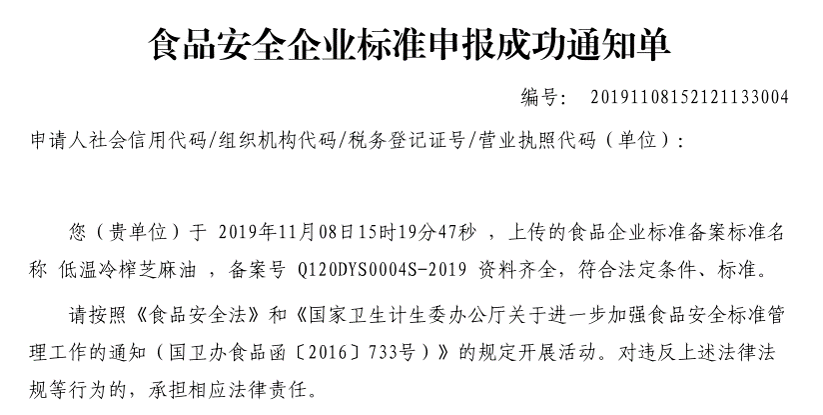 天津東宇順油脂股份有限公司本次備案的企業(yè)標準《低溫冷榨芝麻油》、《混合芝麻醬》、《醇香芝麻醬》,經(jīng)過我公司技術(shù)人員朱麗真老師的編寫、備案,所提交的材料符合天津市衛(wèi)健委的備案要求,于2019年11月成功備案。